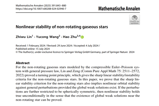 近日,成人动漫 教师王钰聪博士与复旦大学林治武教授、南京大学朱昊助理教授合作研究的论文Nonlinear stability of non-rotating gaseous stars在国际顶级数学期刊Mathematische Annalen(《德国数学年刊》)正式发表。
