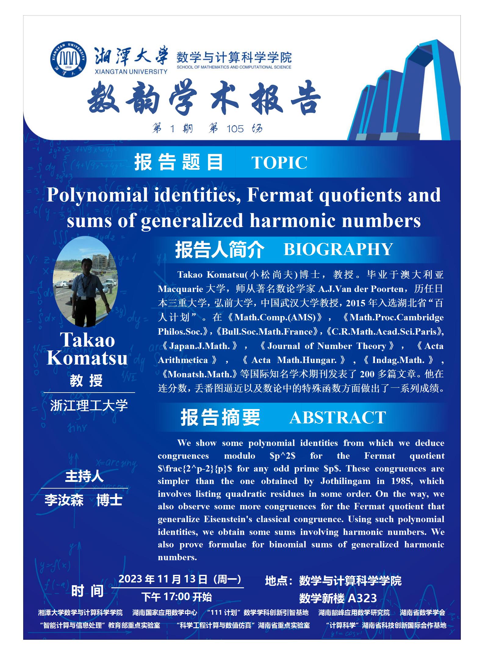 数韵学术报告-Polynomial identities, Fermat quotients and sums of generalized harmonic numbers