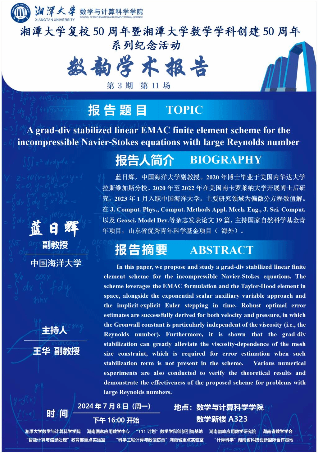 数韵学术报告-A grad-div stabilized linear EMAC finite element scheme for the incompressible Navier-Stokes equations with large Reynolds number