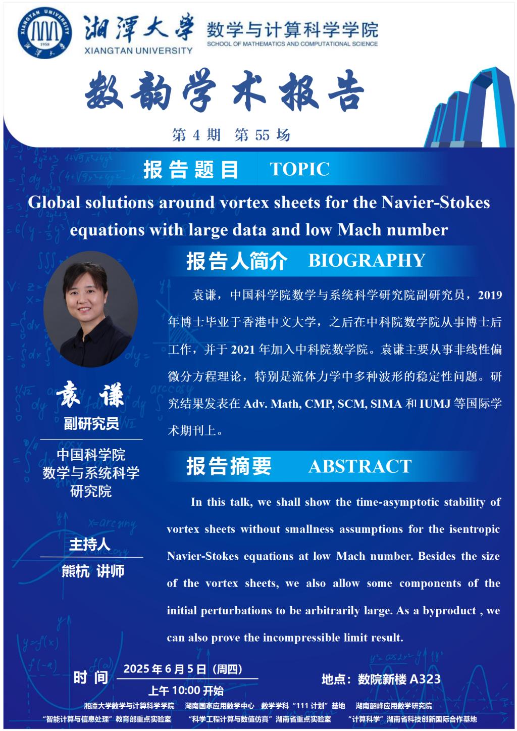 数韵学术报告-Global solutions around vortex sheets for the Navier-Stokes equations with large data and low Mach number